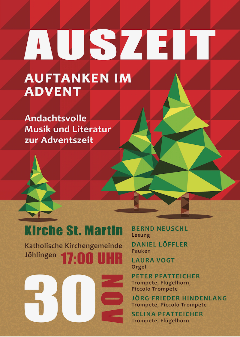 Am 30.11.2025, dem ersten Adventssonntag, findet um 17 Uhr in der Jöhlinger Kirche St. Martin die abendlichen Adventsmusik „Auszeit. Auftanken im Advent“ statt. Hierbei wird Bernd Neuschl heitere und besinnliche Texte vortragen. Für stimmungsvolle Musik sorgen Selina Pfatteicher, Jörg-Frieder Hindenlang und Peter Pfatteicher an den Trompeten und Flügelhörnern. Organistin Laura Vogt und Daniel Löffler an den Pauken begelten das Bläserensemble. Der Eintritt ist frei, Spenden sind willkommen.