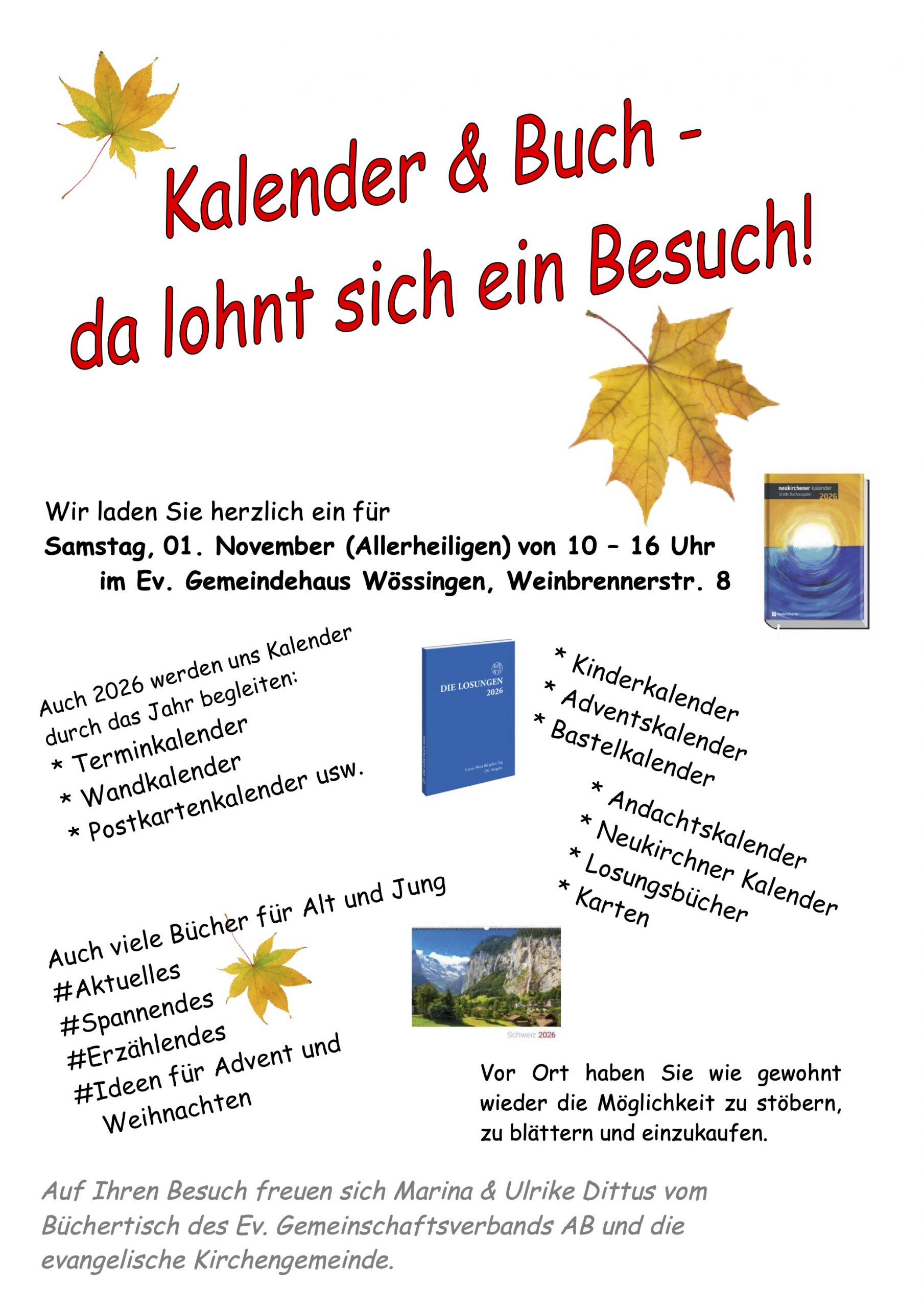 Wir laden herzlich ein zur Kalenderaustellung am Samstag, den 1.11.2025 von 10-16 Uhr im Gemeindehaus. Die Kirchengemeinde bietet begleitend Kaffee und Kuchen an.