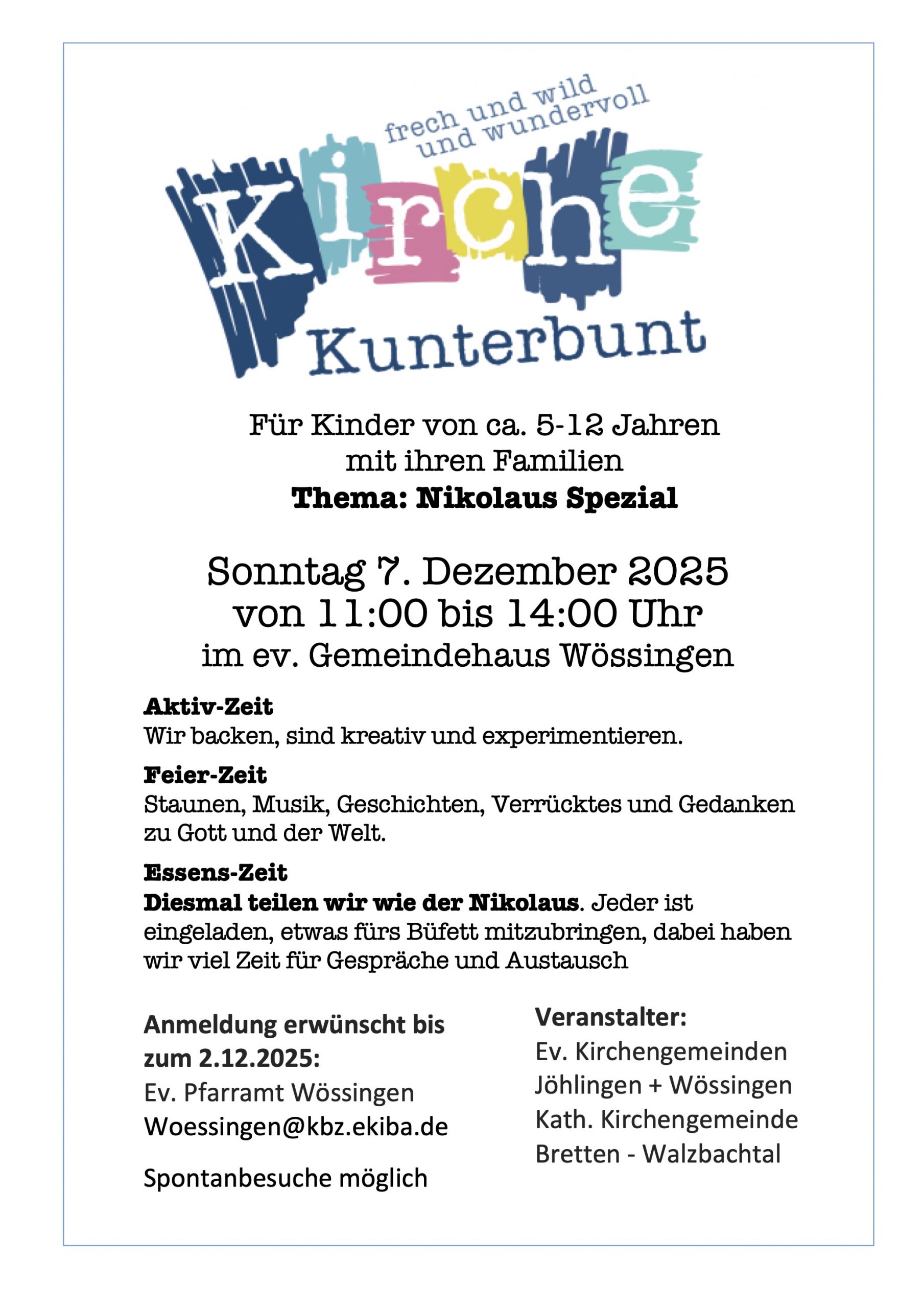 Wir laden herzlich ein zur Kirche Kunterbunt am Sonntag, dem 7.12.25 von 11 – 14 Uhr im evangelischen Gemeindehaus Wössingen