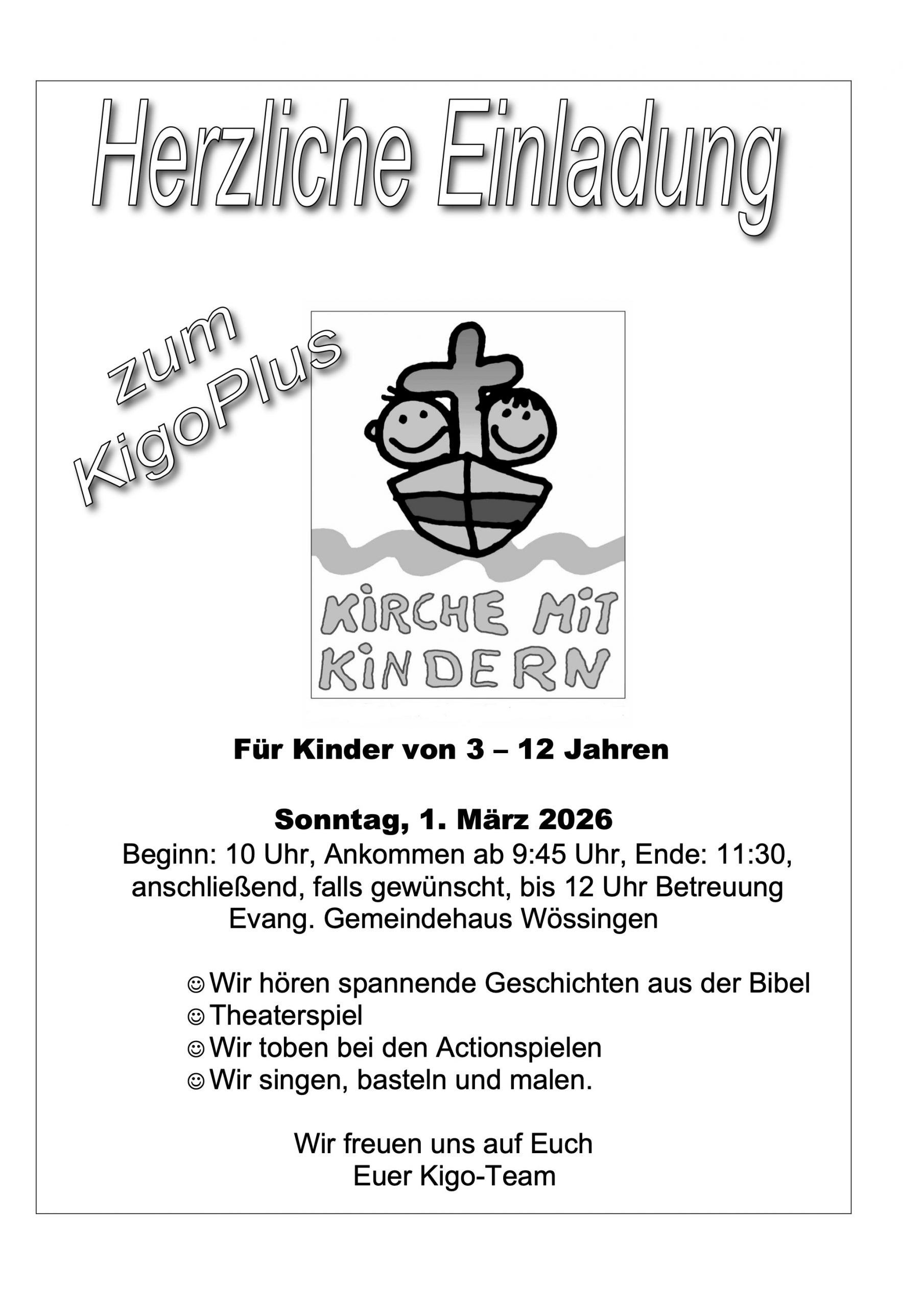 Kigo-Plus 1. Februar 2026 Ankündigungen Herzliche Einladung zum Kigo-Plus am Sonntag, den 1.3.2026 um 10:00 Uhr im Gemeindehaus.