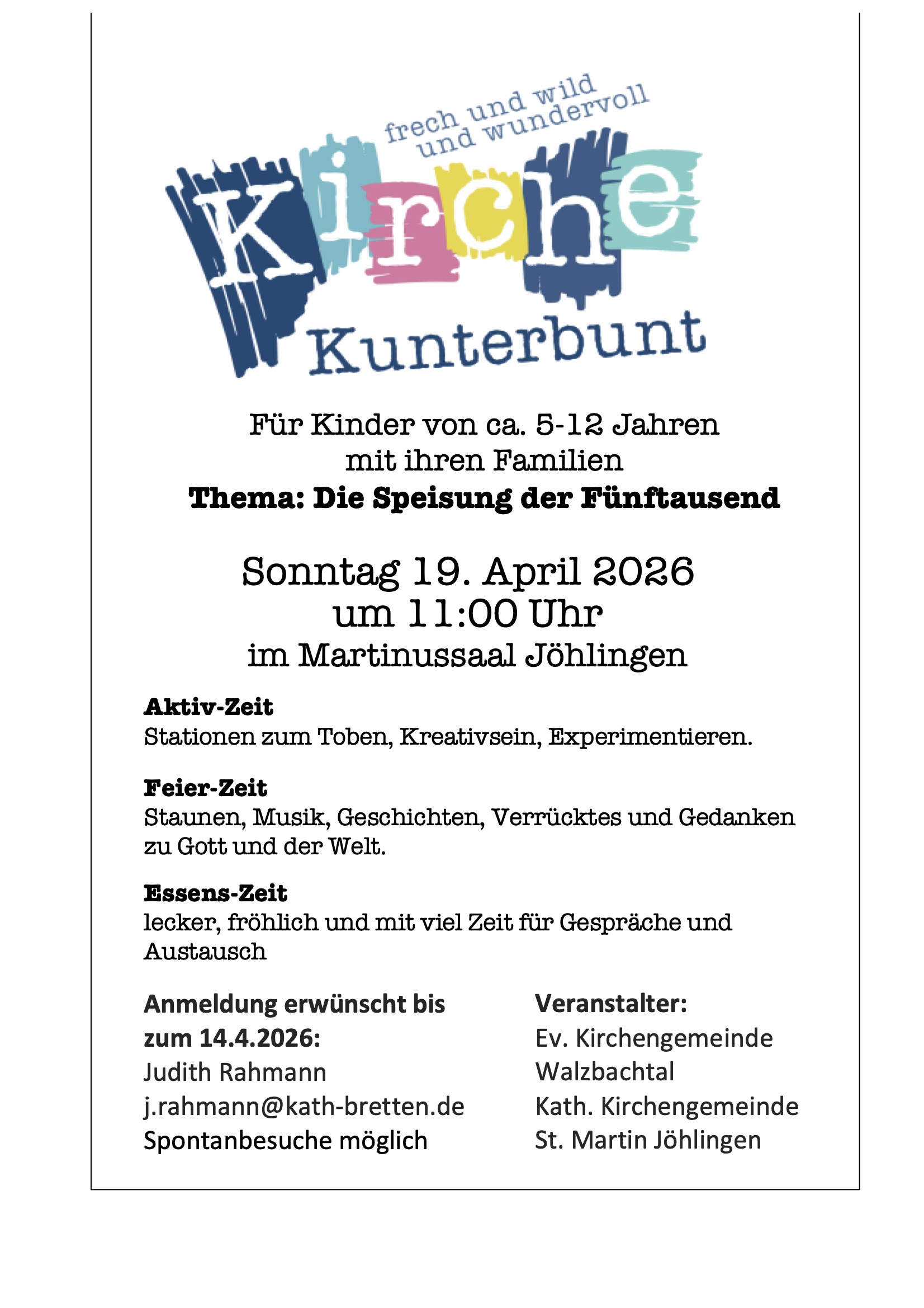 Kirche Kunterbunt 16. März 2026 Allgemeines Herzliche Einladung zur Kirche Kunterbunt am Sonntag, den 19.4.2026 um 11 Uhr im Martinussaal in Jöhlingen.
